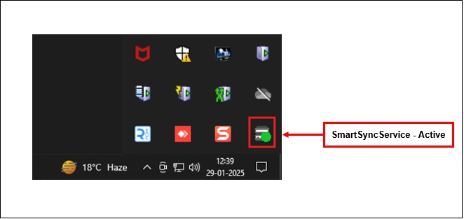 After enabling, wait a few seconds and verify that the SmartSync service System Tray icon shows a green dot. The following SmartSync settings are available from the System tray.