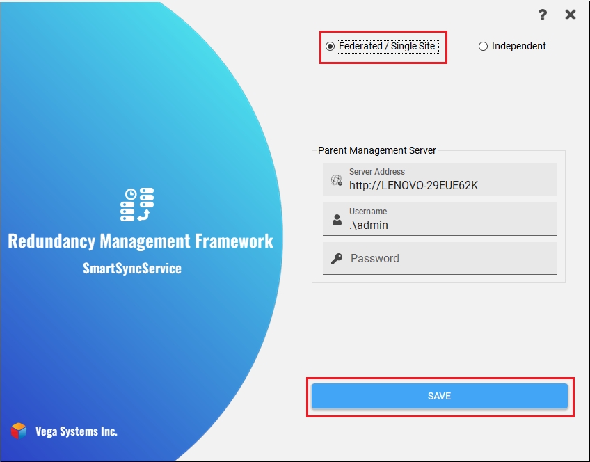 If your XProtect deployment is Federated or a Single Site, select Federated/Single Site; one of these, enter the credentials and click Save.