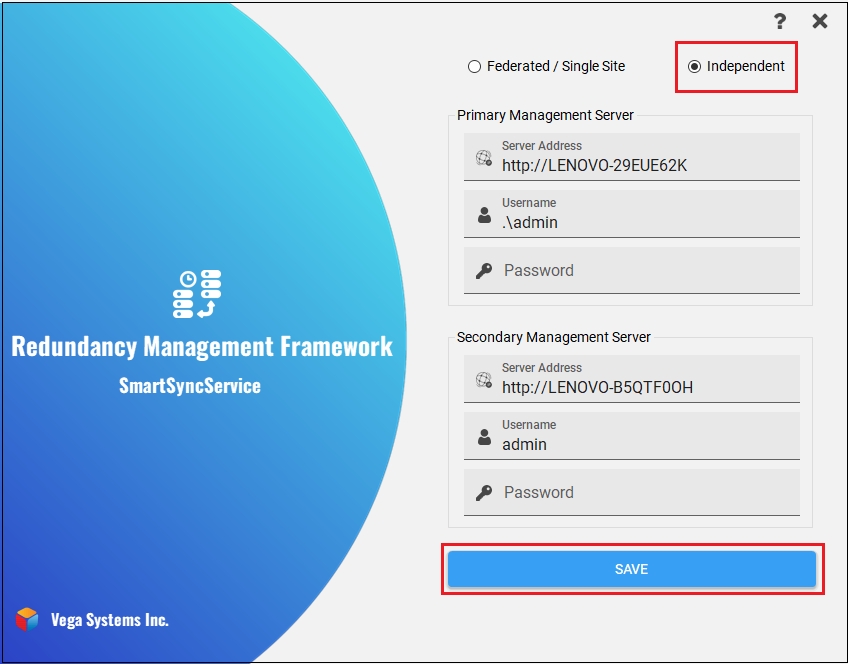 Otherwise, if you have independent XProtect deployments that you wish to synchronize, select Independent, enter the credentials, and click Save.
