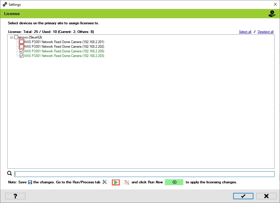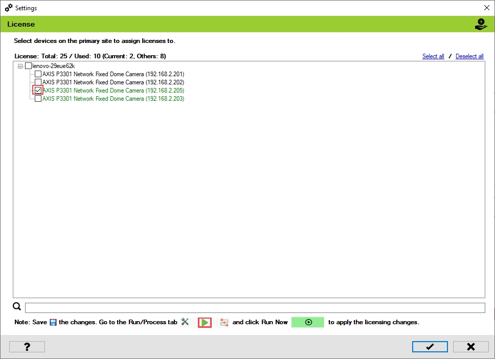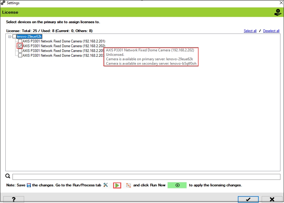 The camera name in black font denotes that it is unlicensed. Select the device check box to assign licenses to it.