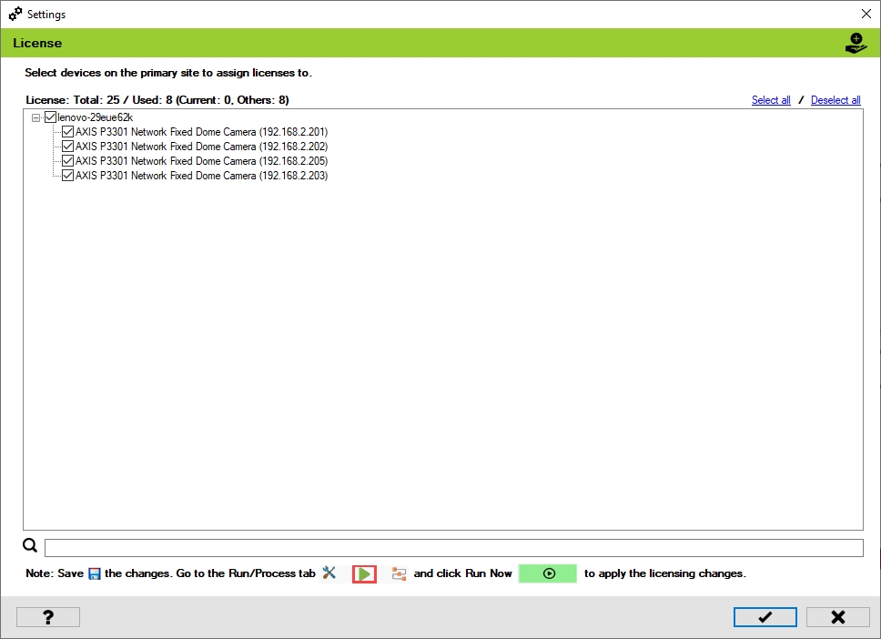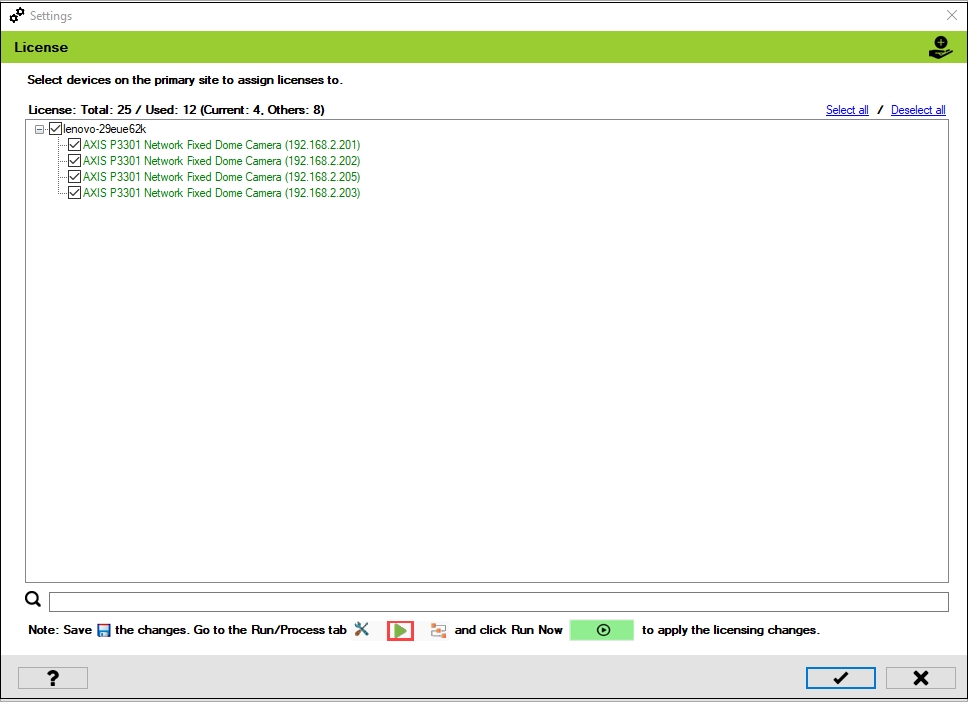 Step Result: The License screen appears. It lists all devices available on the Primary server. The total number of RMF licenses purchased for the current Milestone Software License Code is the total license count.