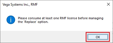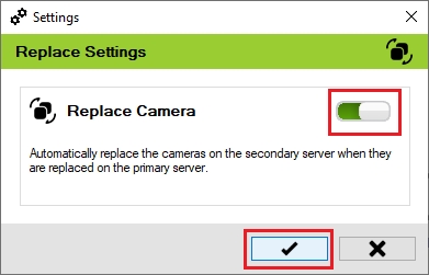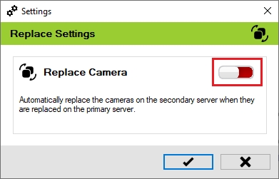 Step Result: The Replace Settings dialog box appears. The Replace Camera toggle button is turned off by default.