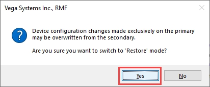 Warning: During the first synchronization run in Restore mode, configurations on the primary site that have not been backed up to the secondary site will be overwritten by the secondary site's settings. For example, if synchronization is scheduled to occur once daily, and the user switches to Restore mode after one of these cycles, any changes made on the primary site between cycles—such as modifying streaming parameters, altering views, device groups, or roles on RMF licensed cameras—will be replaced by the configurations from the secondary site.