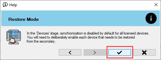 As a precaution, all RMF-licensed devices are unselected by default each time the user moves to Restore mode. Users must manually select the devices they wish to synchronize when switching to Restore mode.