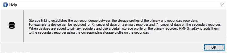 Use Storage Linking to inform RMF how the retention rules on each Primary recorder are translated to its Secondary. Here, you map every storage profile on a Primary (e.g., “30-Day Local”, “7-Day Edge”) to the profile that should be applied on the Secondary (e.g., “90-Day DR”, “14-Day Cloud”). When SmartSync later detects a new camera—or you switch an existing one—to a given profile on the Primary, it automatically assigns the camera to the corresponding profile on the Secondary.