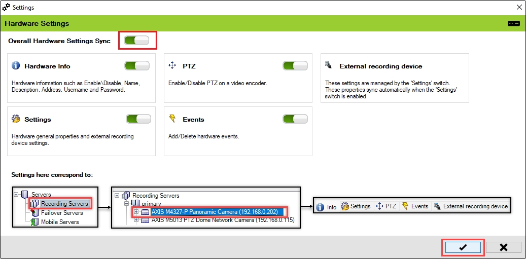 Each hardware device could contain one or more cameras, speakers, microphones, inputs, outputs, and metadata streams. Use this block to control which hardware properties are automatically synchronized by RMF. Such settings correspond to IP addresses, passwords, device-level event definitions, hardware names, etc.