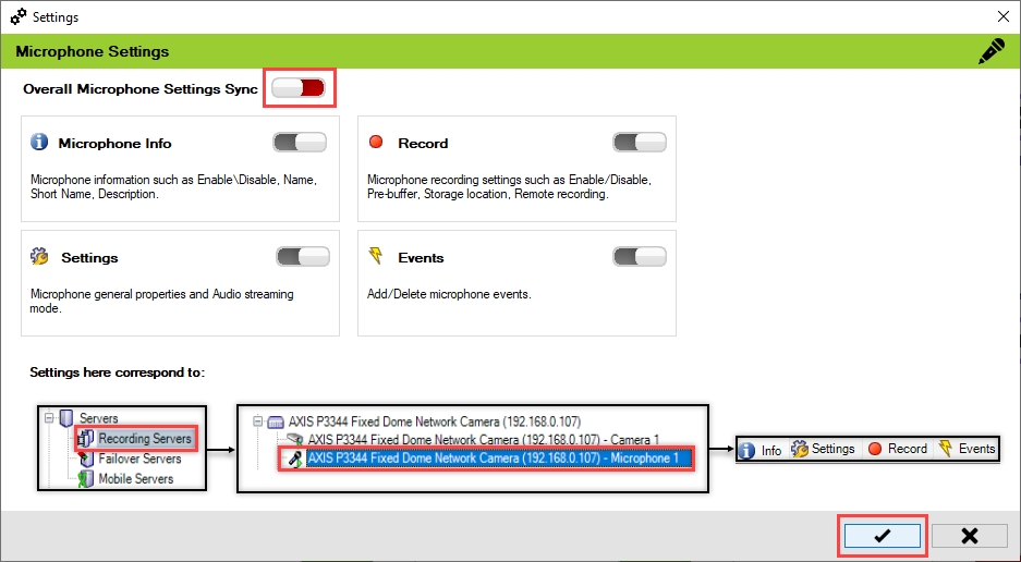 To turn off the synchronization of the microphone settings, move the toggle button to display red and click the Save icon.