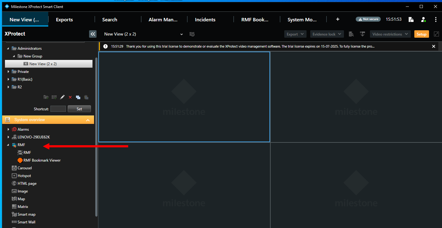 With Release 7.5.0, the requirement to create a โspecialโ RMF view in the Smart Client has been removed. RMF now runs in the background within the Smart Client and provides high availability to all native XProtect view windows displaying RMF-licensed cameras.