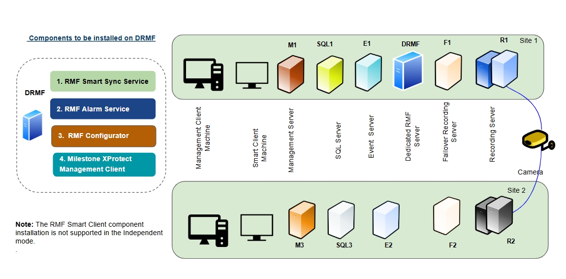 For an independent architecture in a non-clustered mode with more than 500 cameras, the RMF services components must be deployed on a dedicated RMF server (DRMF). This server must have the exact machine specifications as the Milestone Management Server. The DRMF server can be clustered to ensure high availability.