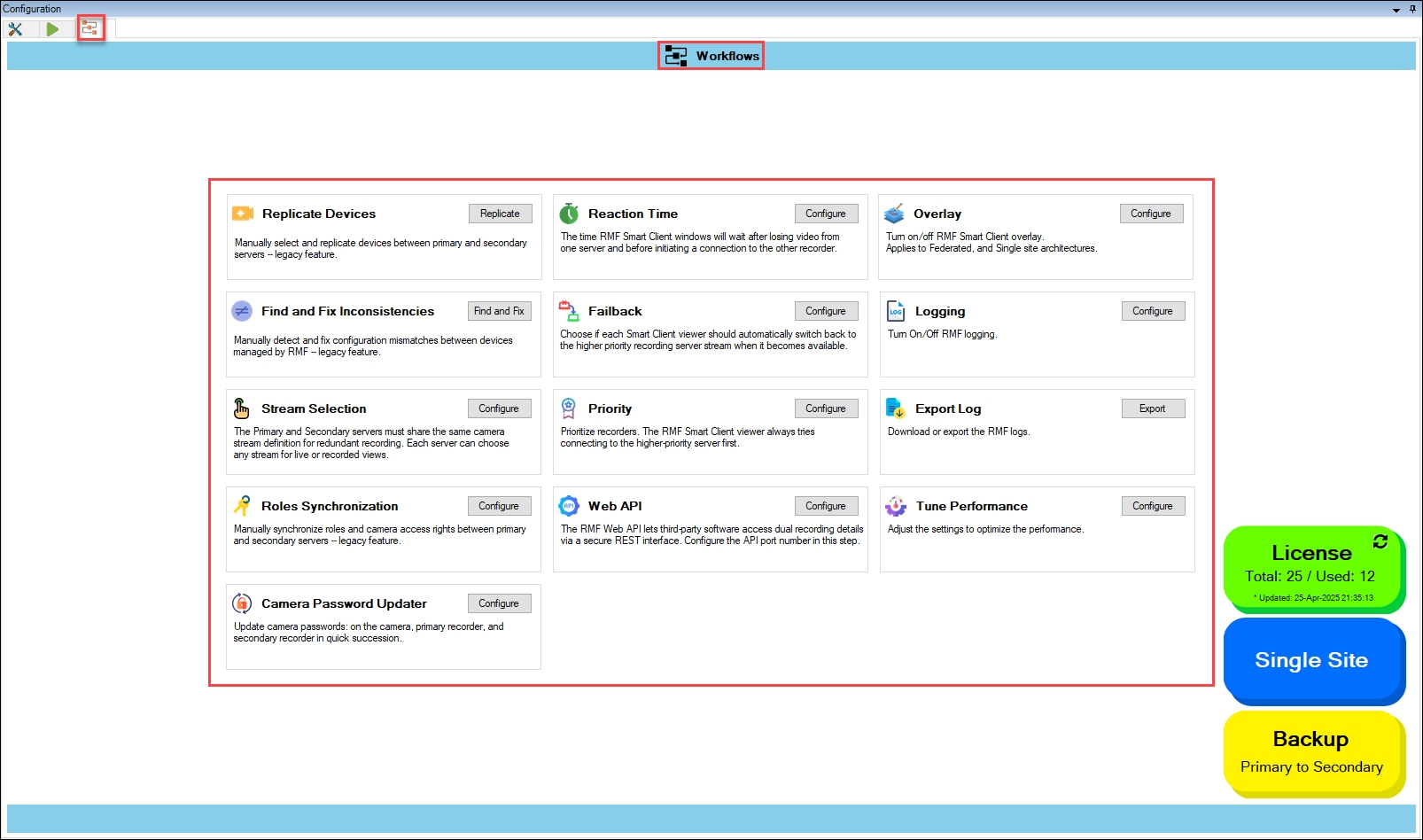 Workflows in the RMF configuration interface are predefined tools or modules that simplify and guide administrators through specific configuration and synchronization tasks between primary and secondary data centers.