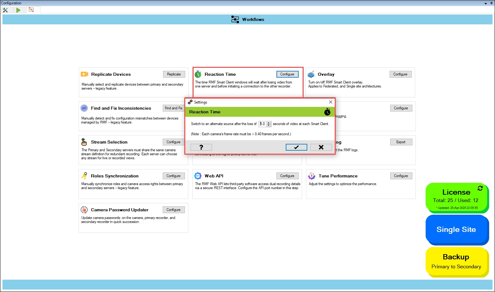 Configure the time the RMF Smart Client view will wait after losing video from one data center before initiating a connection to another. This setting defines a delay period after video loss from the current recording data center before the Smart Client attempts to connect to an alternate recorder. In high-quality networks, you can set the switching time very low to achieve sub-second stream-level failover.